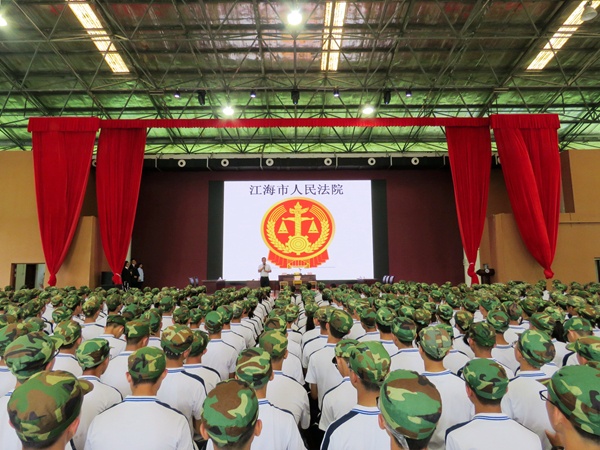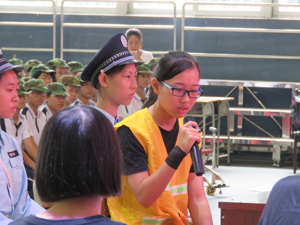 近日,中山二中2019級高一新生軍訓(xùn)在這驕陽似火的夏末秋初如期開展?!罢埲w起立,下面宣讀法庭紀(jì)律……請審判長、審判員入庭……",隨著一聲清脆的法槌聲,在高一年級1000多位學(xué)生殷切目光的翹首期盼下,一場關(guān)于青少年早戀、校園欺凌相關(guān)的模擬庭審在體育館拉開帷幕。