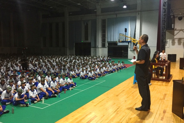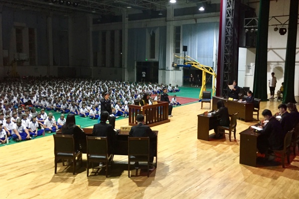 8月25日晚7點(diǎn)正,濠中模擬法庭正式開庭。濠頭中學(xué)黨委書記、校長李茂興、樂水仙副校長、唐昭年副校長、謝石祥副校長、中山市中級(jí)人民法院研究室周方主任、相關(guān)學(xué)校部門負(fù)責(zé)人、高一年級(jí)組、全體班主任及參訓(xùn)的1100名高一新生參加觀摩。