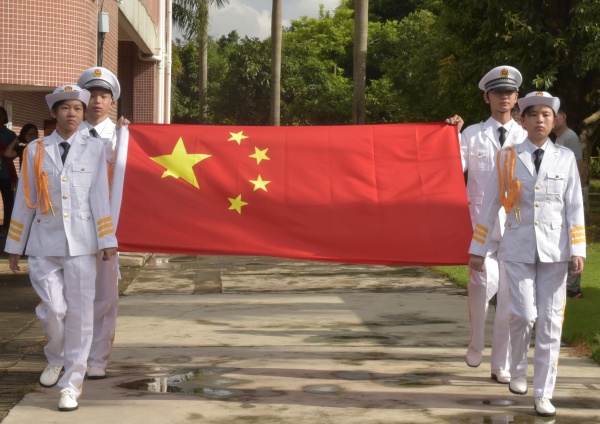 主持人宣布活動開始,四名旗手身著整齊的禮服,邁著整齊的步伐,手持國旗走向升旗臺。