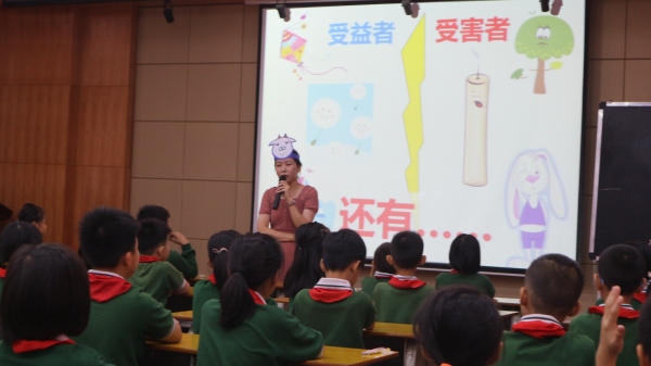 本次研討活動先由劉紫芹老師執(zhí)教三年級《森林聽證會》和謝堅云老師執(zhí)教四年級的《這樣想象真有趣》。劉紫芹老師教學注意激發(fā)學生的興趣,猜謎語引入新課,通過模擬一場森林聽證會,學生角色扮演,代入情境,讓學生在交流討論中放飛想象,清楚合理表達。學生在積極參與課堂學習的過程中能夠領(lǐng)悟童話的編寫既需要大膽想象也需要表達有序。謝堅云老師以“哆啦A夢”的百寶箱導入,激發(fā)學生想象,通過看人物猜故事,鼓勵學生奇妙想象,讓學生在愉快輕松的環(huán)境下學習,學生在謝老師的引領(lǐng)下能夠發(fā)散思維,不少學生能夠有自己的獨特想象,落筆成文。