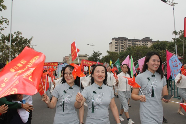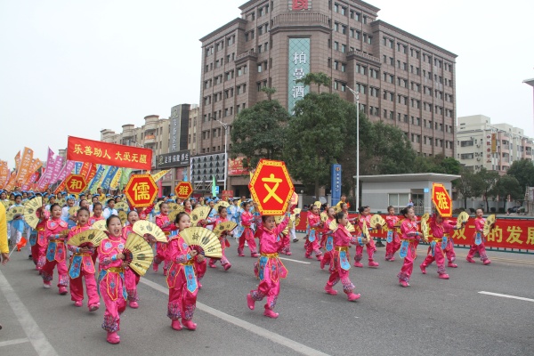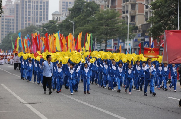 看,四沙小學(xué)方陣來(lái)了!緊跟著校旗的,是“立雅力行,雅而有致”大幅標(biāo)語(yǔ)牌,后面是教師方陣。教師方陣?yán)?,男老師身穿黑色中山裝,穩(wěn)重大方;女老師穿著淺色旗袍,飄逸典雅。學(xué)生方陣在老師的后面。學(xué)生前面,是一輛花車(chē)?;ㄜ?chē)上,該校雅行教育吉祥物文文和雅雅不斷地巡游的人及周邊的群眾揮手致意。學(xué)生們身穿京劇服裝和古裝漢服,高舉“文雅、儒雅、和雅”等大字,一邊走一邊高呼:“文雅立行,雅而有致”。家長(zhǎng)方陣走在最后。家長(zhǎng)方陣彩旗獵獵?!拔难艑W(xué)生 陽(yáng)光成長(zhǎng)”、“儒雅教師 立德樹(shù)人”、“雅行課程 情趣飛揚(yáng)”等彩旗隨風(fēng)招展,襯著家長(zhǎng)們的黃色上衣特別耀眼。該校方陣走到哪里,哪里就是一道亮麗的風(fēng)景線。