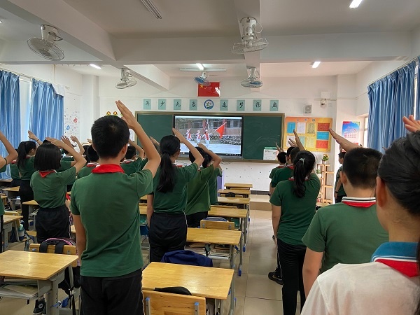 為開(kāi)展本次活動(dòng),師生代表們積極配合大隊(duì)部做好各項(xiàng)前期準(zhǔn)備工作?;顒?dòng)當(dāng)天,“致敬先鋒 爭(zhēng)當(dāng)抗疫小衛(wèi)士”活動(dòng)分享、教師代表祝福、抗疫事跡分享、出旗、唱隊(duì)歌等環(huán)節(jié)通過(guò)釘釘直播方式舉行,各班以中隊(duì)為單位在課室觀看、參與活動(dòng)?;顒?dòng)中,學(xué)校黨支部陳玉玲書(shū)記通過(guò)視頻給同學(xué)們送來(lái)寄語(yǔ):希望孩子們心懷感恩,珍惜時(shí)光,努力學(xué)習(xí),積極鍛煉身體,心有榜樣,將來(lái)做一個(gè)對(duì)國(guó)家、對(duì)人民、對(duì)社會(huì)有貢獻(xiàn)的人才。