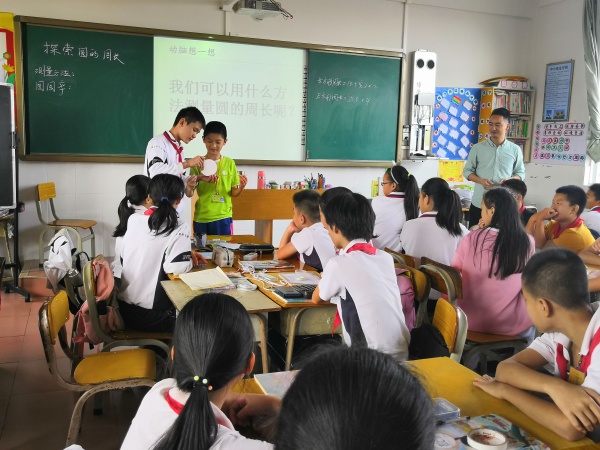 第三課由數(shù)學(xué)組兼職教研員胡誠老師帶來的一節(jié)趣味的《探索圓的周長》。胡老師通過活動——推導(dǎo)公式——應(yīng)用公式來貫穿整節(jié)課。胡老師注重引導(dǎo)學(xué)生動手實踐,在操作中理解知識,發(fā)展思維。胡老師通過讓學(xué)生觸摸圓的周長,引發(fā)了如何求圓的周長問題,再通過實際操作測量讓學(xué)生明白可以通過“化曲為直”的方法求圓的周長,最后通過小組合作探究圓的周長與直徑的關(guān)系,推導(dǎo)出公式。在匯報交流中,羅美園副主任指出胡老師這節(jié)課課抓住了知識點的形成,學(xué)習(xí)方式多樣化,讓學(xué)生體會了數(shù)學(xué)來源于生活,服務(wù)于生活。