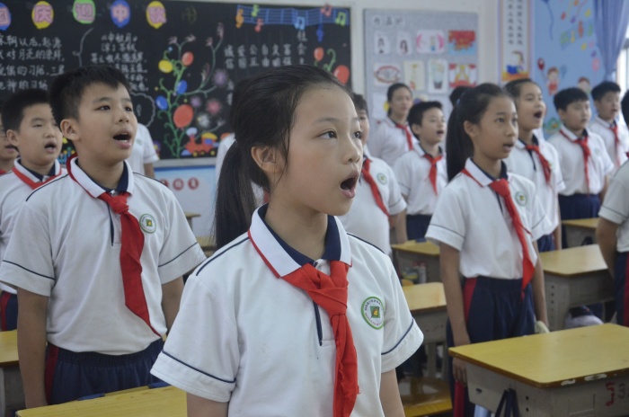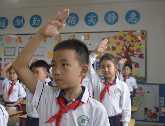教室里,各班的主題隊(duì)會開展得有聲有色。中隊(duì)輔導(dǎo)員帶領(lǐng)隊(duì)員們重溫入隊(duì)誓詞,向隊(duì)員們講述少先隊(duì)的發(fā)展歷程,以及中國女排等先鋒人物的榜樣力量。飄揚(yáng)的紅領(lǐng)巾,崇高的隊(duì)禮,“少先隊(duì)員”是我們最驕傲的名稱,“我們是共產(chǎn)主義接班人”是我們最嘹亮的歌聲。