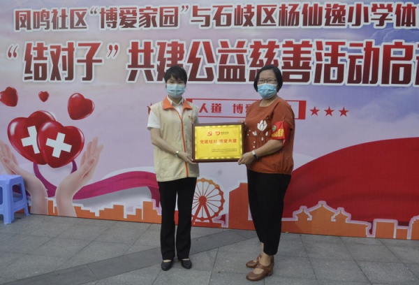 隨后,鳳鳴社區(qū)黨委向楊仙逸小學(xué)體育路學(xué)校黨支部贈送“黨建結(jié)對,博愛共建”紀念牌匾,參與活動的領(lǐng)導(dǎo)嘉賓向各班級班主任頒發(fā)“結(jié)對子”關(guān)愛牌。全體人員合影留念,正式為本次公益慈善活動按下“啟動”鍵。