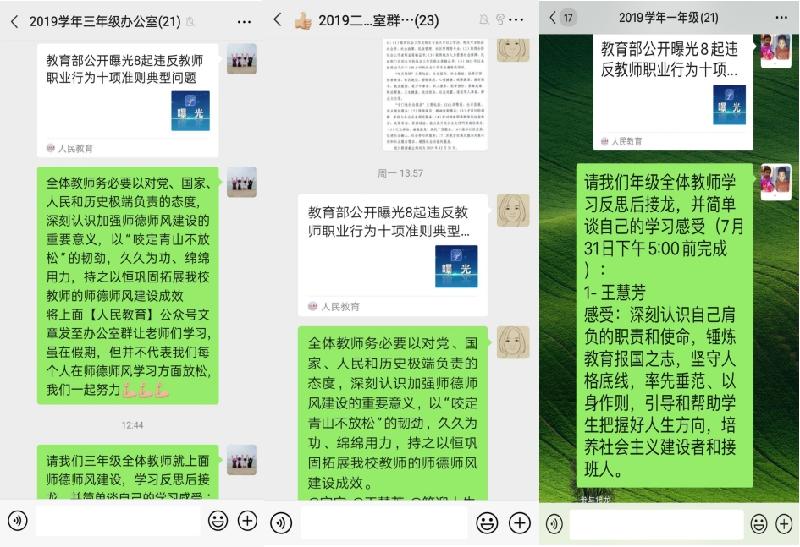 “師者,以德為先”。高尚的師德師風(fēng)是教師從事教育工作的靈魂。為了進(jìn)一步加強(qiáng)教師隊伍建設(shè),不斷提高教師職業(yè)道德素質(zhì)和師德修養(yǎng),保障全體教師在良好師德師風(fēng)塑造和學(xué)習(xí)中的不松懈和持續(xù)性,7月27日-30日,在暑假期間,龍江城區(qū)中心小學(xué)組織全體教師在線上重點學(xué)習(xí)了“教育部公開曝光8起違反教師職業(yè)行為十項準(zhǔn)則典型問題”一文,并進(jìn)行了自我反思和學(xué)習(xí)心得的分享交流。