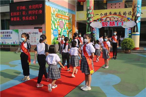 在六年級(jí)的哥哥姐姐們的引領(lǐng)下,一年級(jí)的小朋友沐浴著陽(yáng)光穿越智慧門(mén),步進(jìn)教室開(kāi)啟新的學(xué)習(xí)生活。“正衣冠”環(huán)節(jié)讓孩子們懂得了先正衣冠,后明事理的含義?!靶腥Y”分別是“愛(ài)國(guó)禮”、“尊師禮”、“友愛(ài)禮”。在“人字開(kāi)筆”環(huán)節(jié),一年級(jí)新生寫(xiě)出了簡(jiǎn)單而意義深遠(yuǎn)的“人”字,寓意著在人生的啟蒙階段,要學(xué)會(huì)做人,是像自己認(rèn)真書(shū)寫(xiě)的“人”字一樣頂天立地!隨后,全體新生在成長(zhǎng)樹(shù)上展示了自己書(shū)寫(xiě)的“人”字。