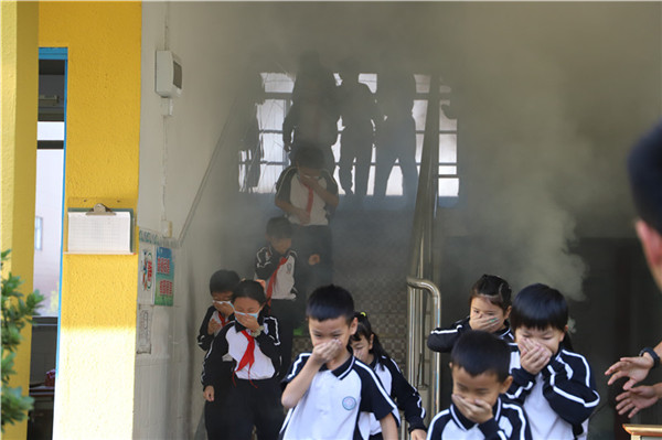 十三點(diǎn)整,警報(bào)聲響徹校園,濃煙滾涌而來(lái),學(xué)生們按照地上箭頭方向,迅速?gòu)姆阑鹜ǖ揽诔冯x。學(xué)生們一個(gè)個(gè)神情肅穆,捂住口鼻,迅速而有序的從通道口撤離險(xiǎn)情現(xiàn)場(chǎng)。樓內(nèi)疏散人員按照預(yù)先的消防演習(xí)方案疏散學(xué)生,保證在樓內(nèi)學(xué)生的安全,以免慌亂中出現(xiàn)擁擠或者踩傷學(xué)生事故。學(xué)生們逃生到一樓之后,就排成方隊(duì)。隨后區(qū)祥海校長(zhǎng)和黃主任都做了總結(jié)。區(qū)校長(zhǎng)通過(guò)介紹日本的逃生素養(yǎng)和南海區(qū)平洲鎮(zhèn)的火災(zāi)案例教育學(xué)生們重視演練、認(rèn)真學(xué)習(xí)逃生要領(lǐng),珍愛(ài)生命。