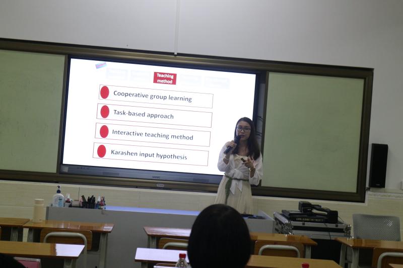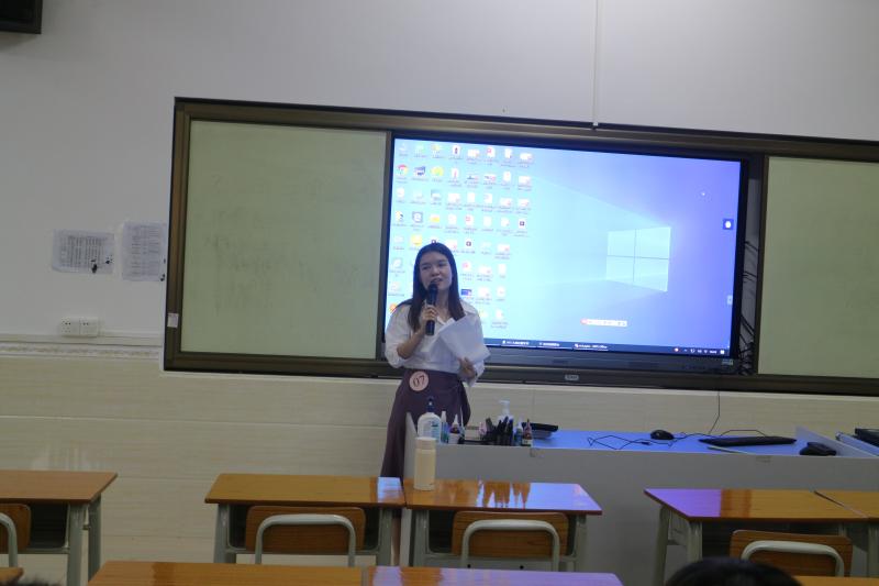 第二環(huán)節(jié)是選手按抽簽順序進行才藝展示及演講比賽。每位選手首先播放錄制的才藝視頻或者進行現(xiàn)場三分鐘才藝展示,然后按照抽簽的題目進行三分鐘英文演講。才藝展示中,選手們“各顯神通”,從唱歌到鋼琴彈唱,從短視頻配音到拍攝趣味教學視頻,從現(xiàn)場微課再到錄課展示……可謂讓人大開眼界,嘆為觀止。演講環(huán)節(jié)中,各位青年教師結(jié)合自身經(jīng)歷,紛紛闡述個人觀點,讓人印象深刻。
