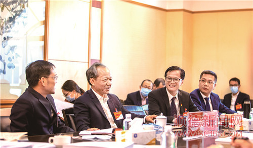 佛山市委副書記、順德區(qū)委書記郭文海(左二)來到陳村代表團(tuán),聽取代表的意見和建議并發(fā)言。/珠江商報(bào)記者周焯杰攝