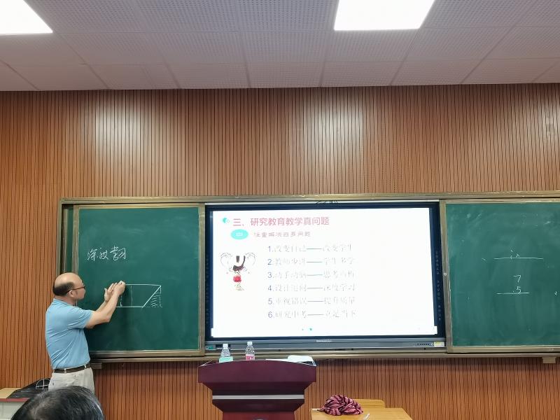 第二部分,鄧?yán)蠋煘樗械臄?shù)學(xué)老師們開(kāi)展了以“研究教育教學(xué)真問(wèn)題”為主題的專(zhuān)題講座,特別提到三個(gè)方面:(一)是研究教材備好課,建議老師們從6個(gè)方面去研究,編者意圖,知識(shí)技能,前后聯(lián)系,教育價(jià)值,學(xué)生情況,學(xué)法教法,講到教法時(shí),還展示了今年的中考題,以具體的題目來(lái)親自示范,對(duì)于他提到的方法,讓老師們大開(kāi)眼界;(二)注重解決自身問(wèn)題,從6個(gè)方面給老師們提供了很好的建議,改變自己,教師少講,動(dòng)手動(dòng)腦,設(shè)計(jì)追問(wèn),重視錯(cuò)誤,研究中考;(三)科研課題從哪里來(lái)?從教育教學(xué)實(shí)際問(wèn)題中來(lái),從各級(jí)各類(lèi)課題指南中來(lái),從他人課題名稱(chēng)中來(lái)。無(wú)論是哪一方面,鄧?yán)蠋熤v的都很接地氣,老師們都聽(tīng)得非常認(rèn)真,收獲很多。