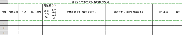 有意應(yīng)聘者請(qǐng)將個(gè)人簡歷、教師資格證、身份證、學(xué)歷證書、獲獎(jiǎng)證書掃描件等復(fù)印件、近期彩色照片1張和聯(lián)系方式打包發(fā)送一份email到此郵箱: ljbeihaixiaoxue@163.com,另外應(yīng)聘者用xlsx文檔按照以下附件1的表格并填好發(fā)到以上郵箱,我校按照招聘條件,根據(jù)網(wǎng)上報(bào)名情況,對(duì)照應(yīng)聘人員遞交的書面材料進(jìn)行資格審查,符合條件的應(yīng)聘人員,將安排進(jìn)行面試。