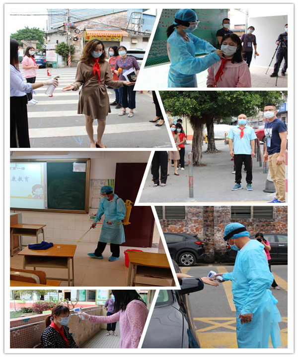 第一個演練場景是學校大門。為了筑起校園疫情防控的第一道防線,學校大門按嚴格要求圍蔽,修繕了消毒通道。早晨,戴好防護口罩和手套的值日教師、保安人員提前到崗。首先,值日教師指揮各年級同學按照有一定間隔距離排隊、維持秩序。接著,值日教師在消毒通道前,提醒學生佩戴好口罩,用消毒藥水為學生消毒,并井然有序地進校門,然后進行體溫測量。當發(fā)現(xiàn)一位學生體溫異常,穿戴好防護服和口罩、護目鏡的檢測員立即關(guān)閉入校通道,將疑似高溫學生帶入校門口旁的健康觀察室,進行水銀體溫計量度體溫復測,發(fā)現(xiàn)再次異常,立即通知衛(wèi)生部門何鳳施主任和班主任到場。同時,由保健老師楊老師檢查、安撫、詢問異常學生,了解有無任何疫區(qū)接觸史和外出史等基本情況,檢測體溫,并做好登記;班主任及時致電家長復核確認學生是否有流行病學史,并通知家長接學生去看病,發(fā)現(xiàn)體溫復測仍然偏高,班主任向分管行政何鳳施主任匯報情況,立即啟動應急處理程序,逐級上報。待該學生離開健康觀察室后,由何老師帶后勤人員負責消毒。病患學生離校后,由衛(wèi)生健康副校長指導下開展后續(xù)工作。