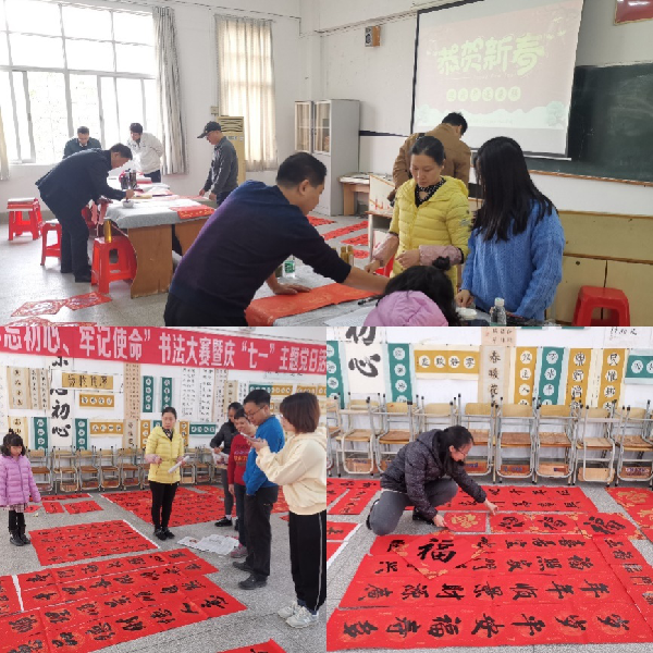 本次活動邀請了韓雨龍、鐘全榮、李華、王海平、鄧富華、劉建華等具有書法特長的黨員教師揮毫潑墨、送福迎新。工會委員提前精心準(zhǔn)備了對仗工整、精煉喜慶的春聯(lián)集錦,供全校教職工選擇。